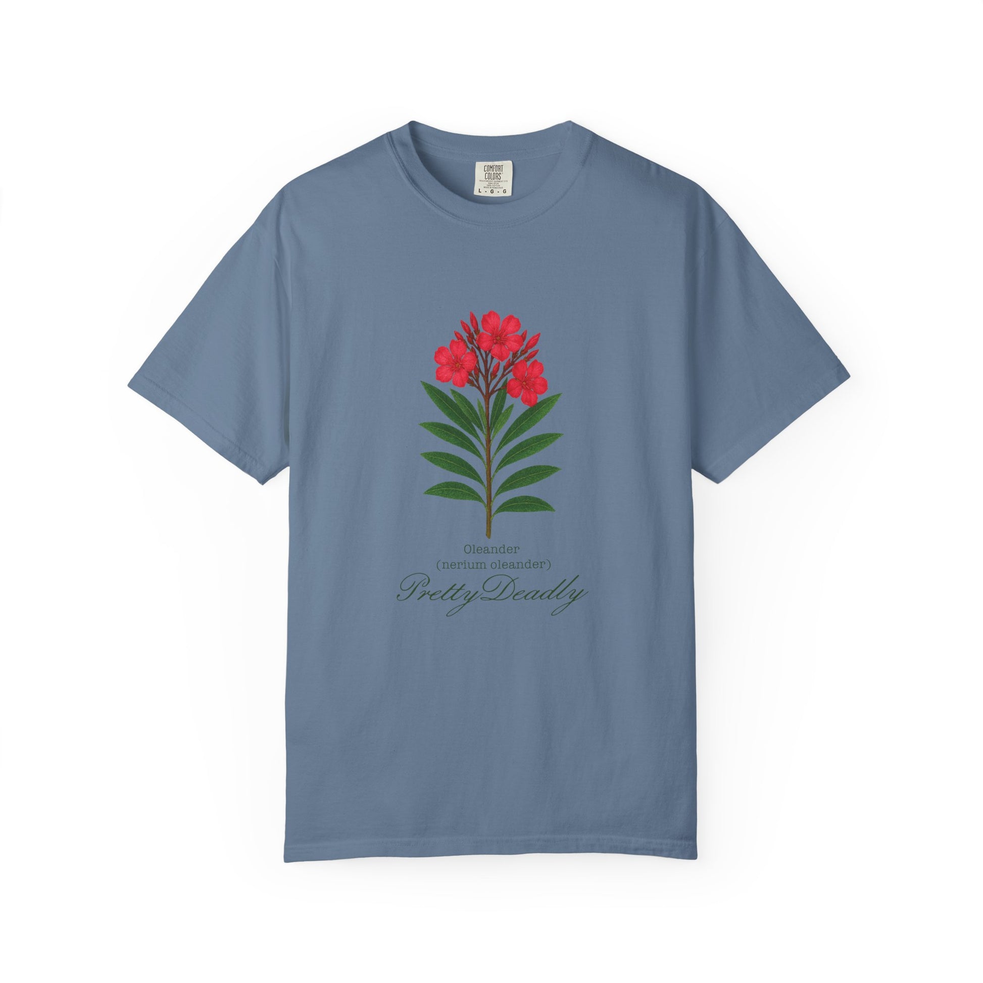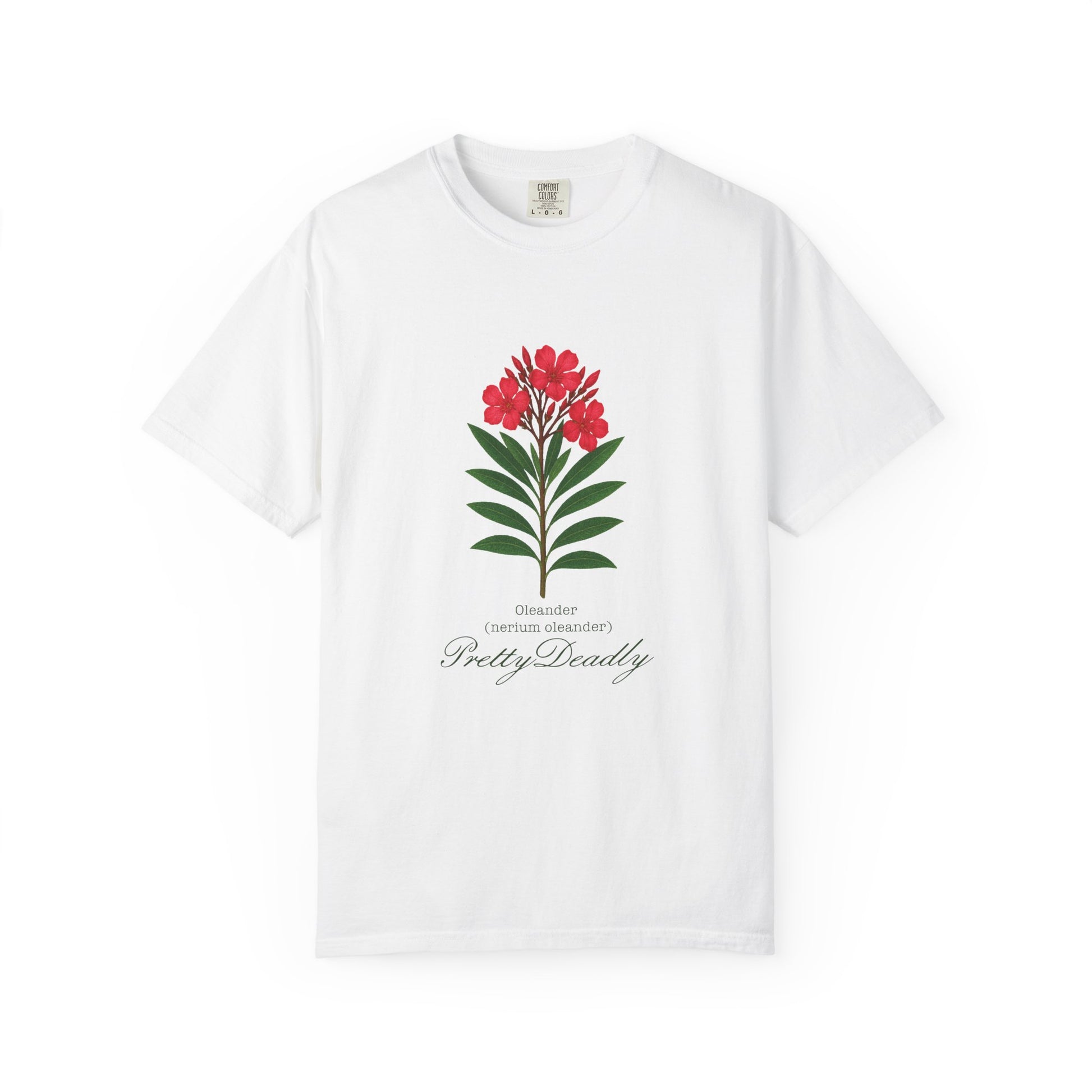 "Pretty Deadly," t-shirt featuring a funny take on the Oleander (nerium oleander) plant. Perfect for pop-culture fans who love a bit of botanical plant-based sass, this shirt adds humor and attitude to your casual wardrobe. Easy to wear and guaranteed to get a laugh, it’s your new go-to for playful, offbeat style.